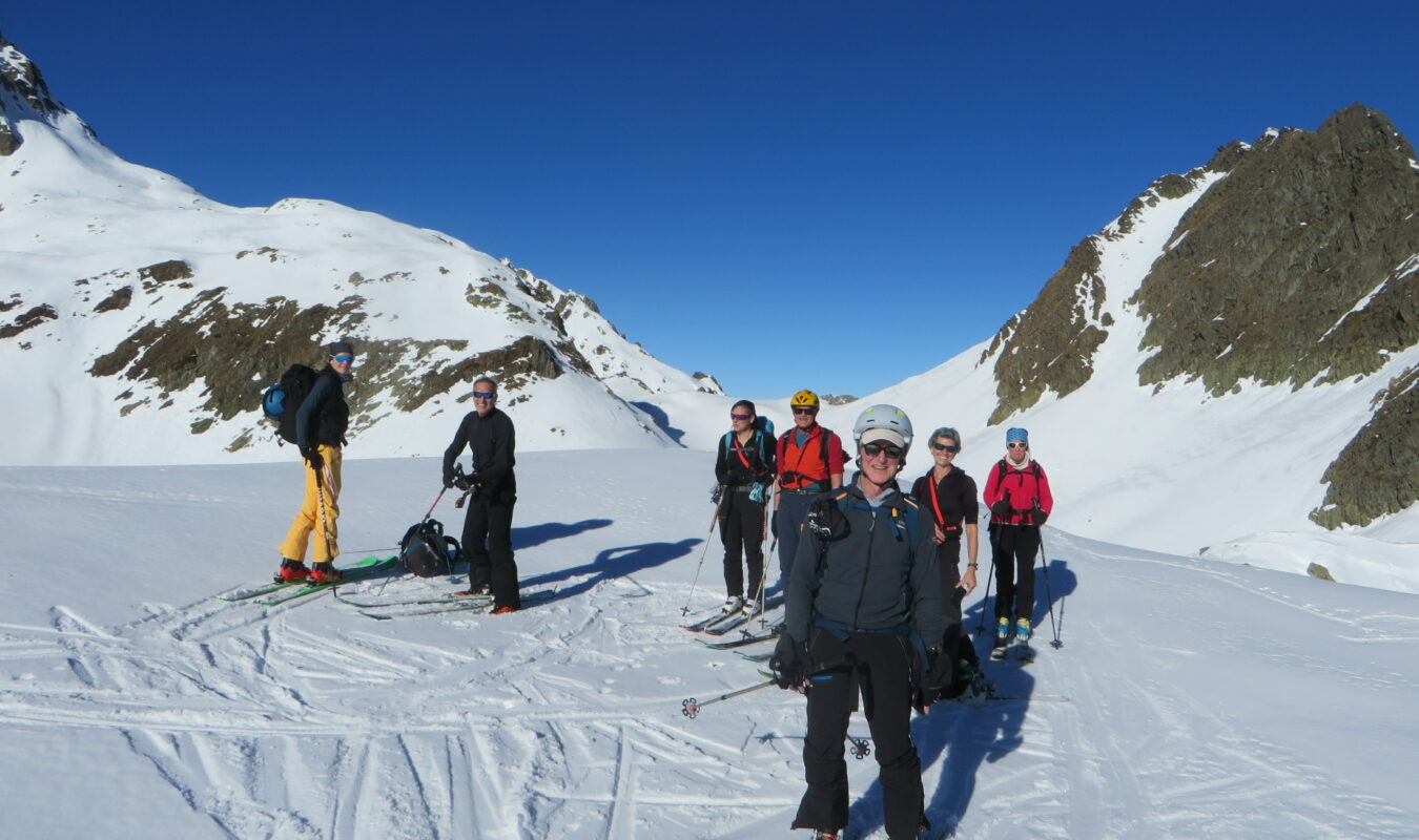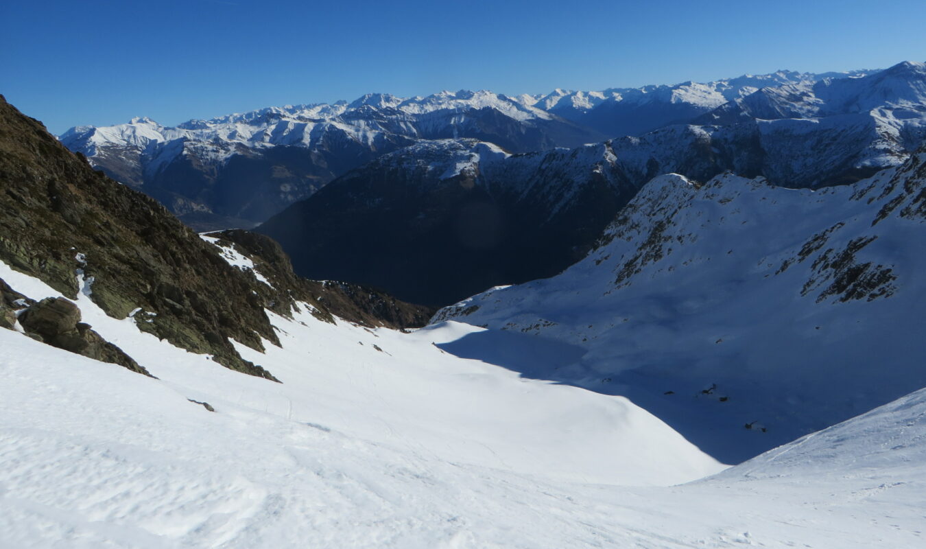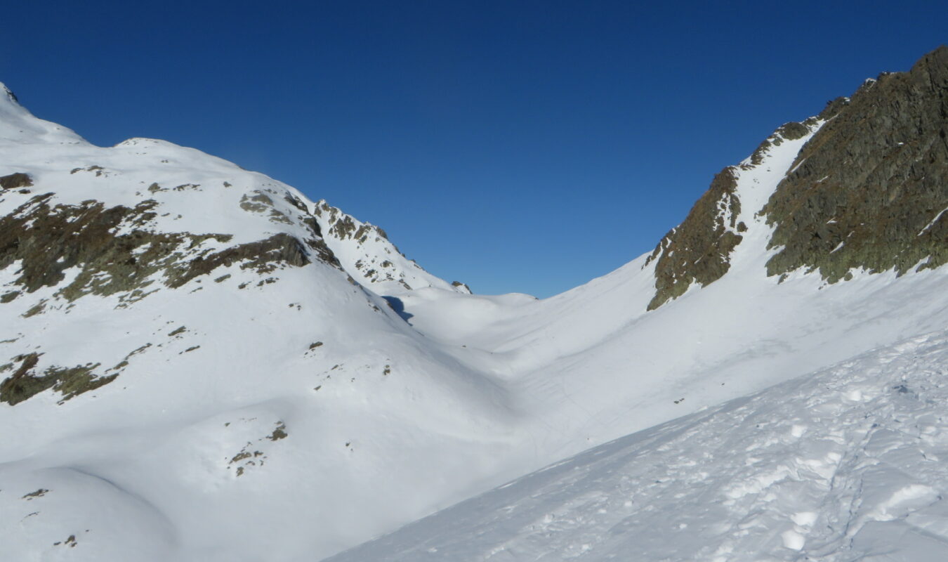 Descente sur neige dure mais bien portante dans les combes à l’ombre.