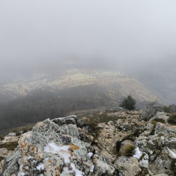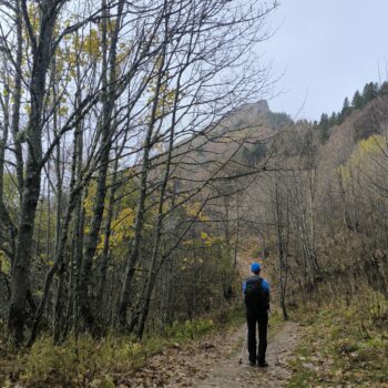 Les bâtons seront utiles pour retenir un glissade et un bain de boue. Et si vous en avez, c’est le moment de mettre les crampons à neige (ou boue) dans le fond du sac.