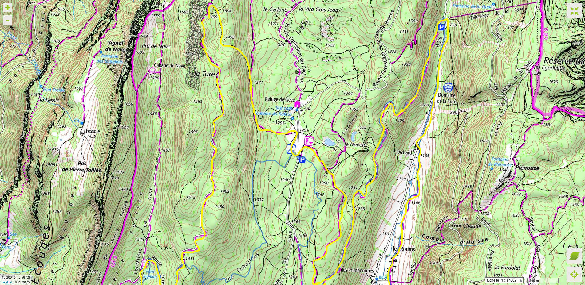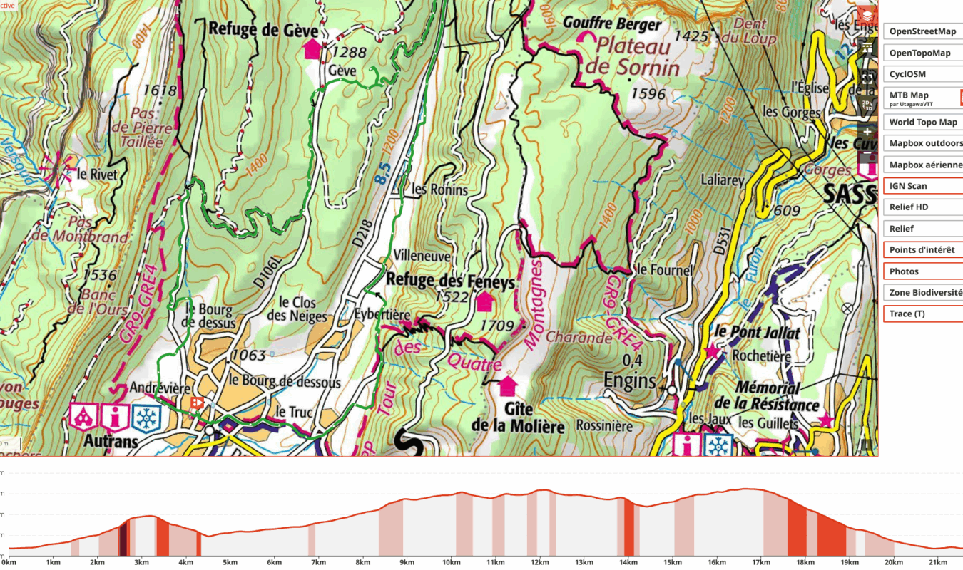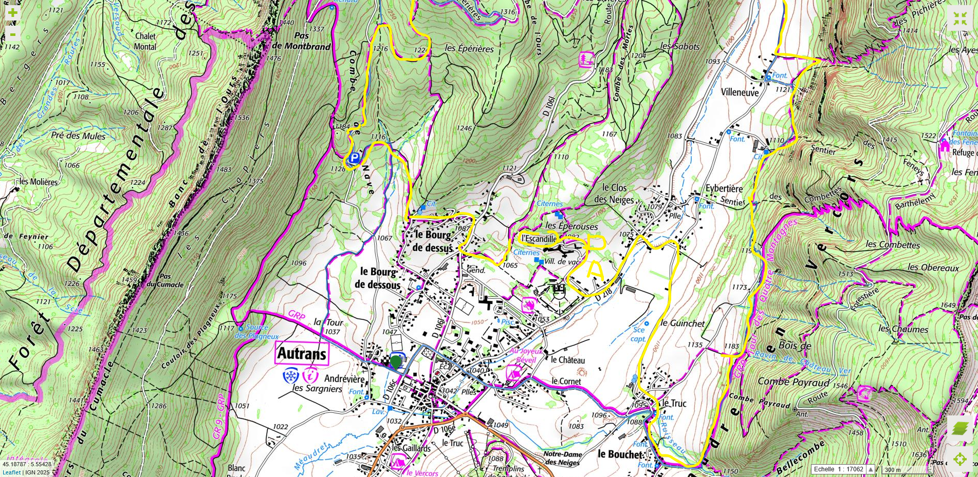 AUTRANS (1040 m) . GROTTE de la TURE (1330 m) . GEVE (1289 m). Les FEES (1275 m). Télésiège de La Quoi (1254 m). L’ACHARD (1178 m). Les RONINS (1127 m). Villeneuve (1124 m). Le TRUC (1094 m). AUTRANS .